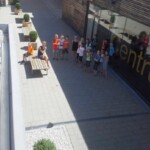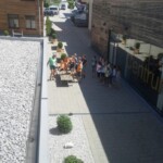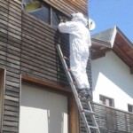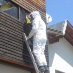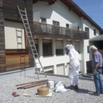 Unter den neugierigen Augen der Schulkinder wurden die Holzlatten der Fassade abgeschraubt, um Zugang zum Schwarm zu bekommen. Danach wurden die Bienen in einen Korb gekehrt und am Boden abgestellt. Bis zum Abend fanden sich alle Bienen in der neuen Behausung ein und wurden einem Imker übergeben.