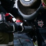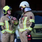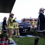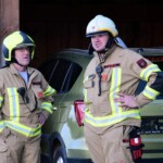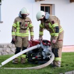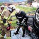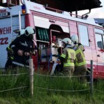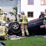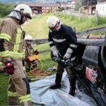 Übungsannahme 2: Verkehrsunfall durch einen schaulustigen Autofahrer ⇒ Überschlag des PKWs in den Garten eines Privathauses, Bergung der beiden eingeklemmten Personen mittels Bergeschere und Hebekissen.