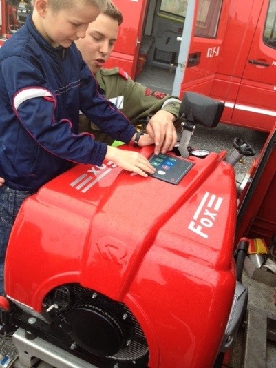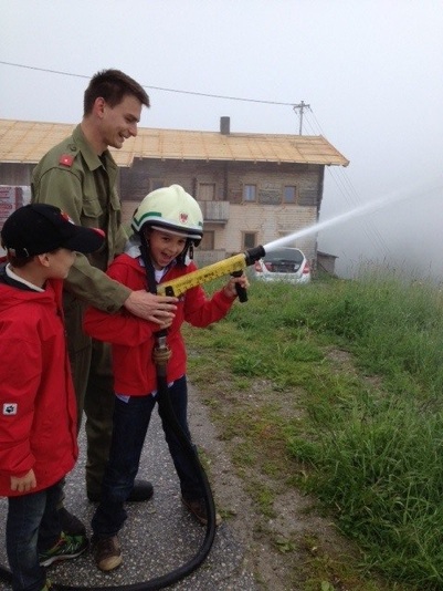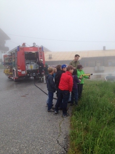 Der Zugskommandant-Stellvertreter Dominik Pircher erklärte in der zweiten Station die Tragkraftspritze und bei der dritten Station konnten die Kinder unter Anweisung von Thomas Vockenberger den Hochdruck ausprobieren.